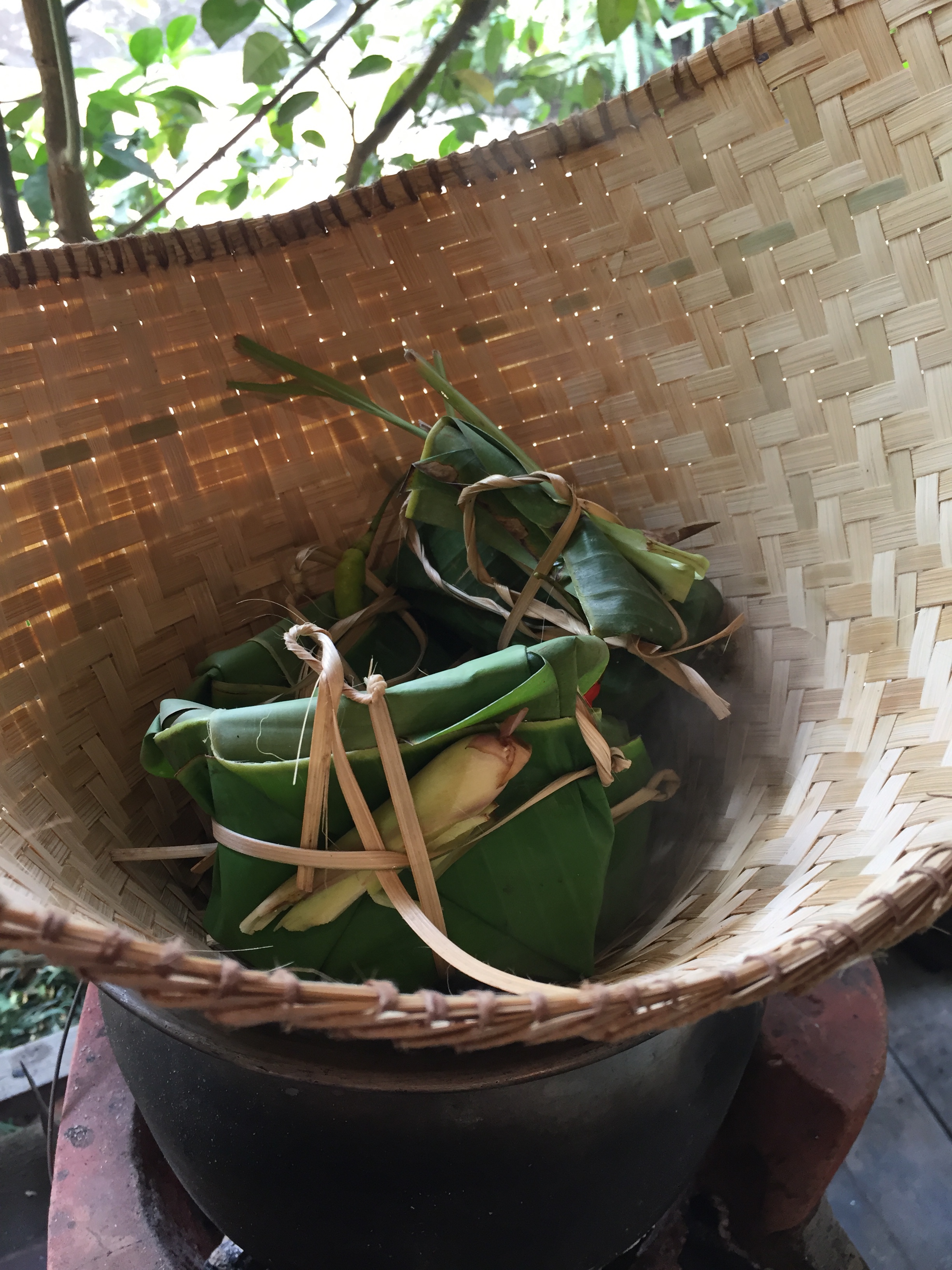 We prepared four main dishes: jeow (eggplant or tomato dip), mok pa (fish wrapped in banana leaf), buffalo laap, and lemongrass stuffed chicken.