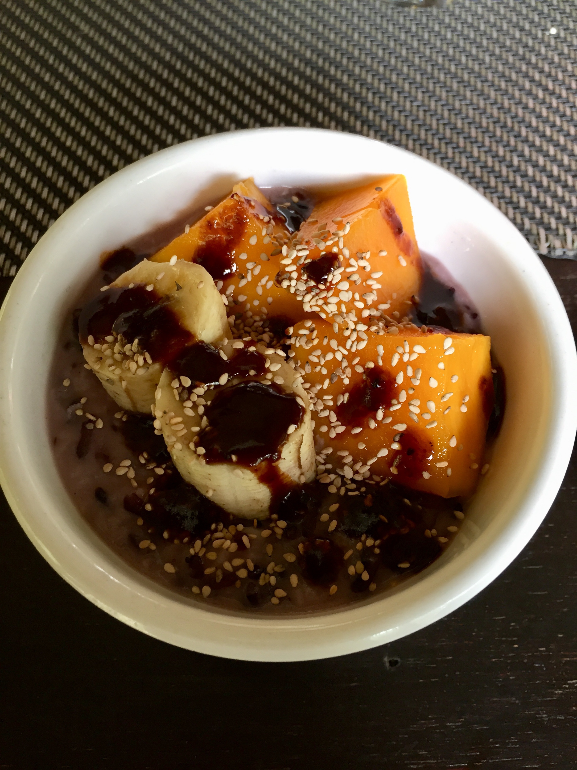 We finished off with dessert: khao gam, which is purple sticky rice with coconut milk, topped with fresh fruit and tamarind sauce. We even made our own coconut milk.