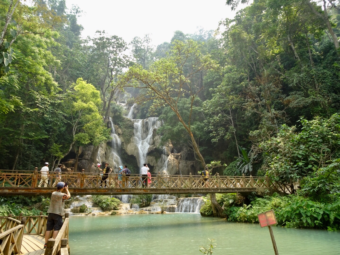 The falls are a top tourist attraction in Luang Prabang. They are situated within a limestone rich jungle, flowing into three cascading pools that have a distinct green colour. They probably look even more impressive during wet season when water levels are higher.