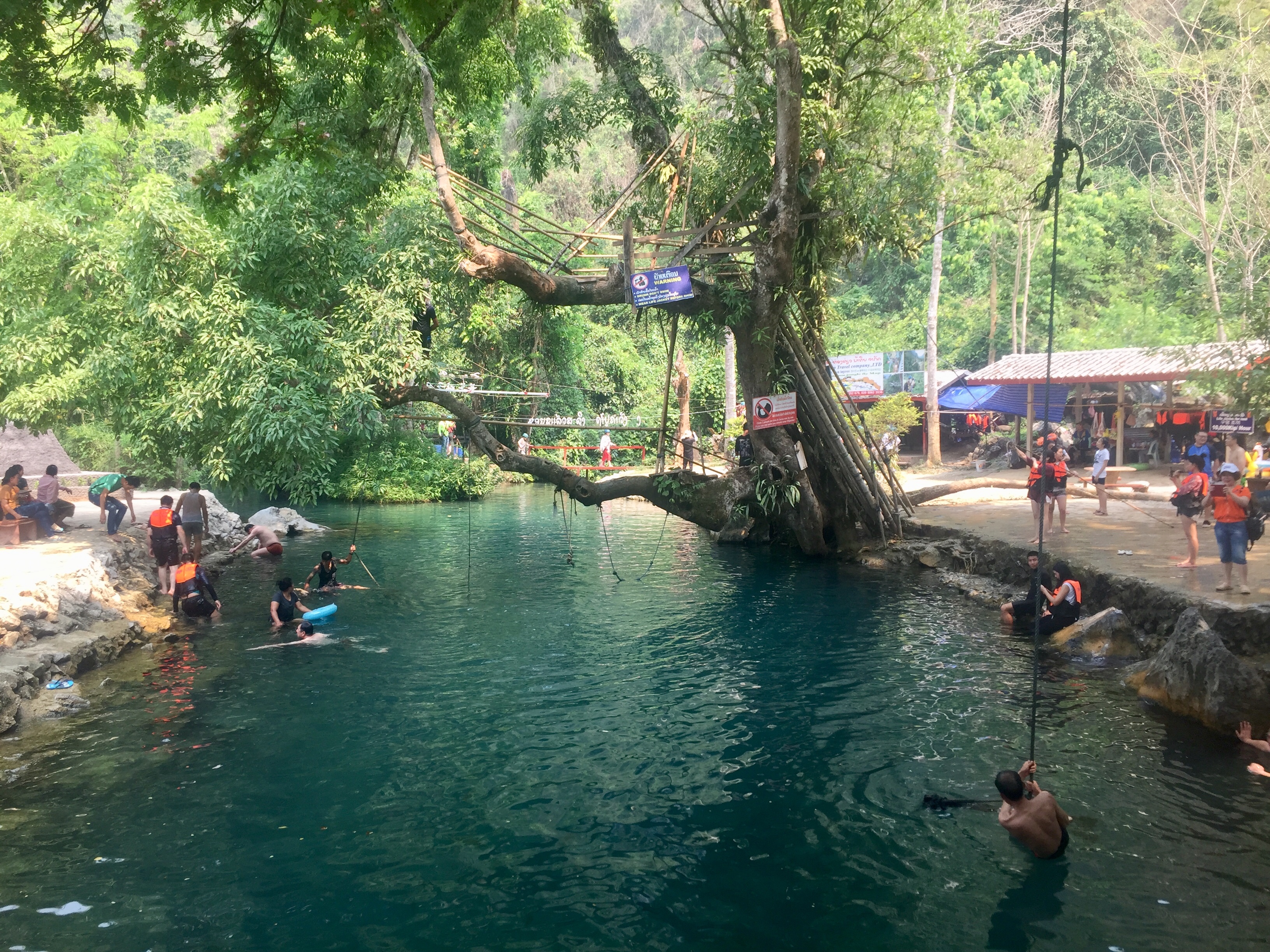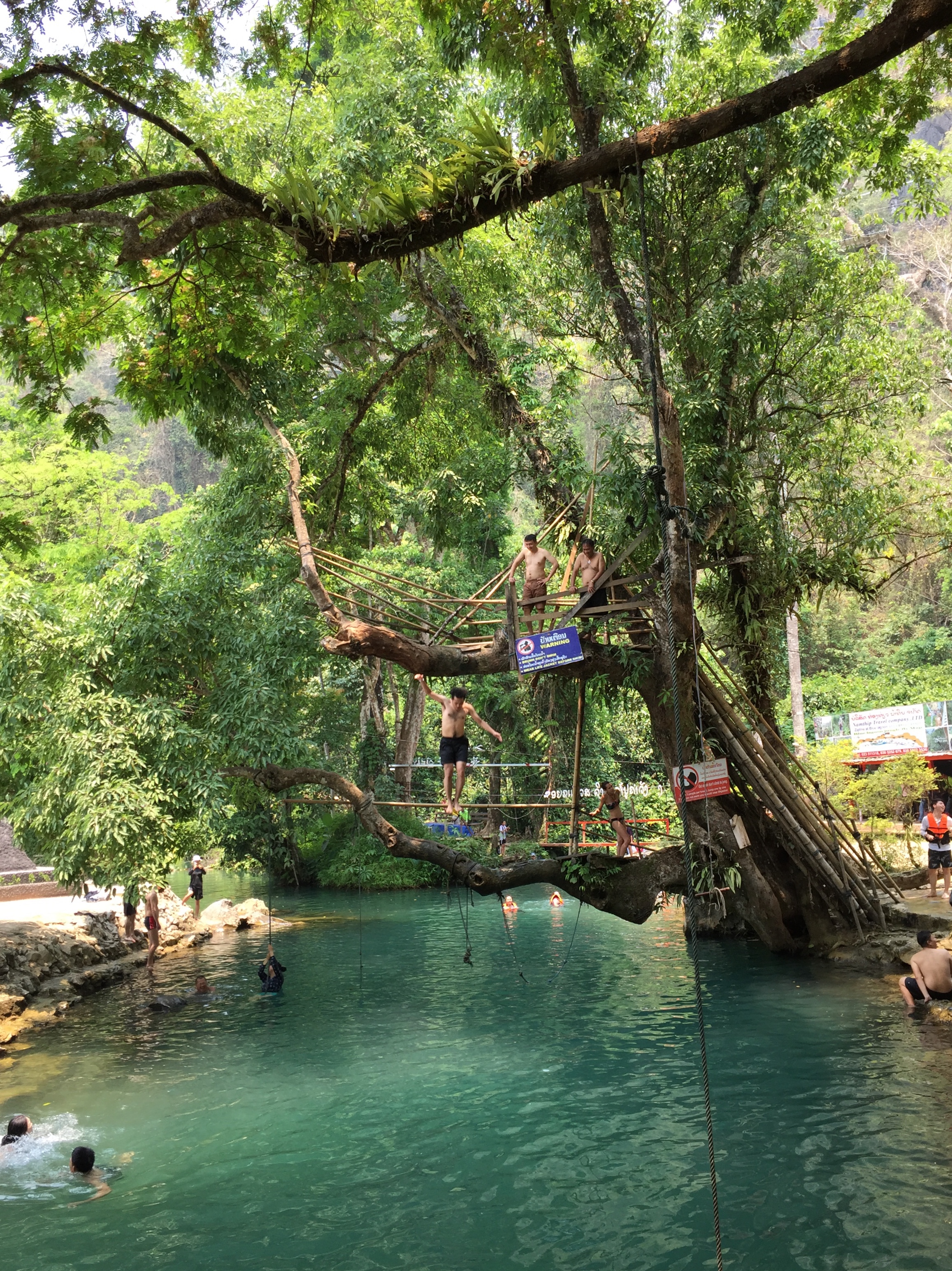 We booked a tuk tuk to take us to the Blue Lagoon, a popular swimming hole located about a 20 minute drive from the centre of town. It’s also possible to bicycle there in 45 minutes or walk in 2 hours, if you’re keen on getting sweaty. We paid 200,000 kip for the private tuk tuk transfer, which included the toll for the wooden bridge crossing Nam Song River. Entry to the lagoon was a separate fee of 10,000 kip each.