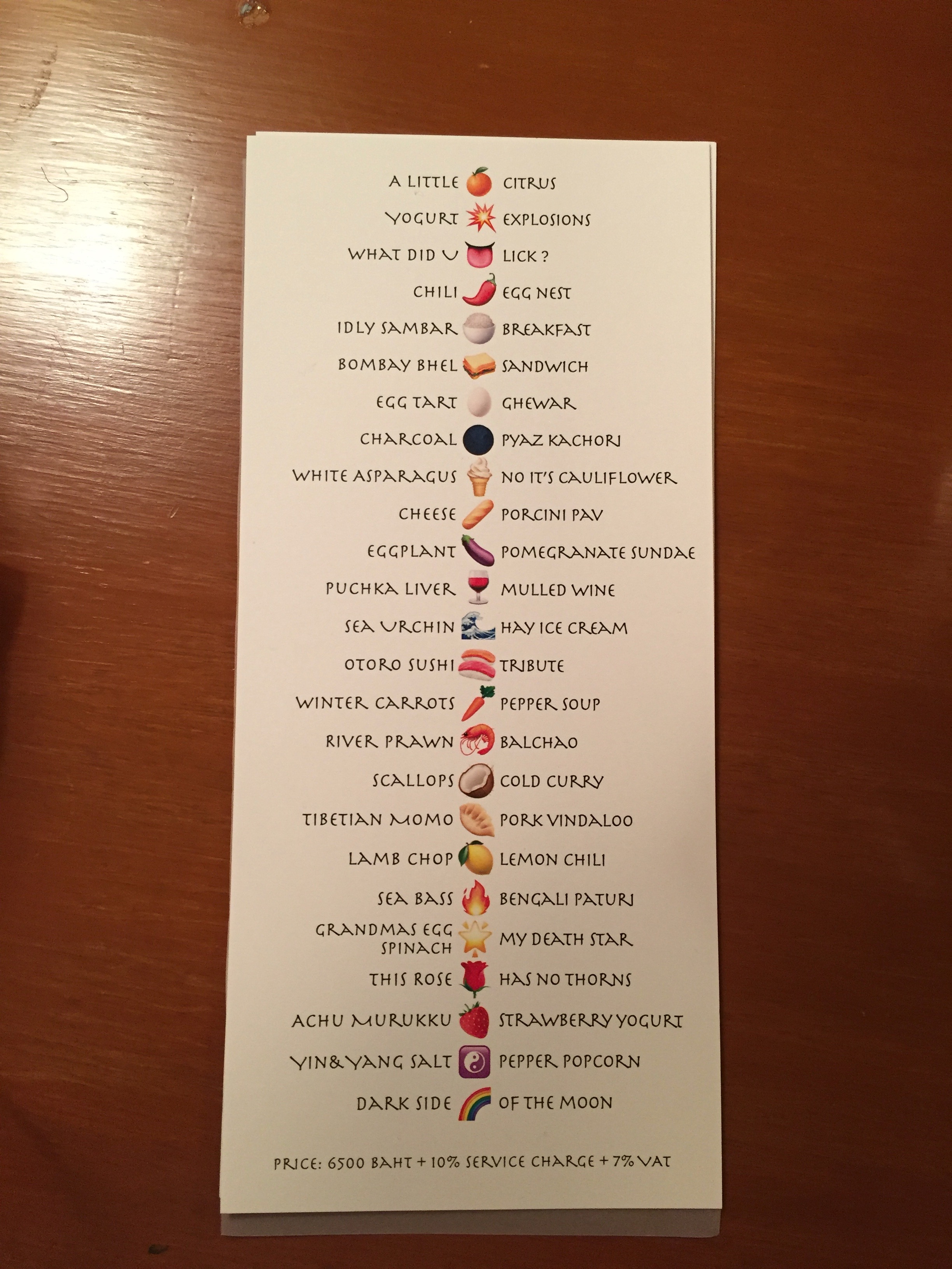 The 25 course bite size tasting menu was presented as only a list of emojis and we received a copy of the final menu at the end of the meal.