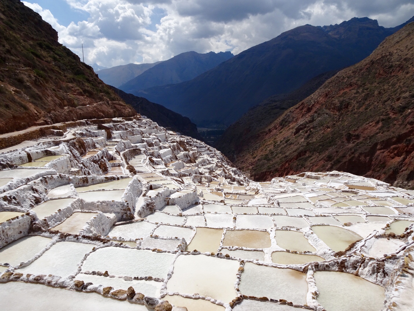 The striking Maras salt mines were our next stop. The descriptor of ‘mines’ is actually a misnomer as there is no real mining that occurs here. Rather, salt is extracted from a natural salted spring. The spring discharges a stream of water, which is diverted into salt pans and then evaporated to produce high quality salt. Each pan is owned by separate households or individuals, a couple of whom we observed tending to their pans.