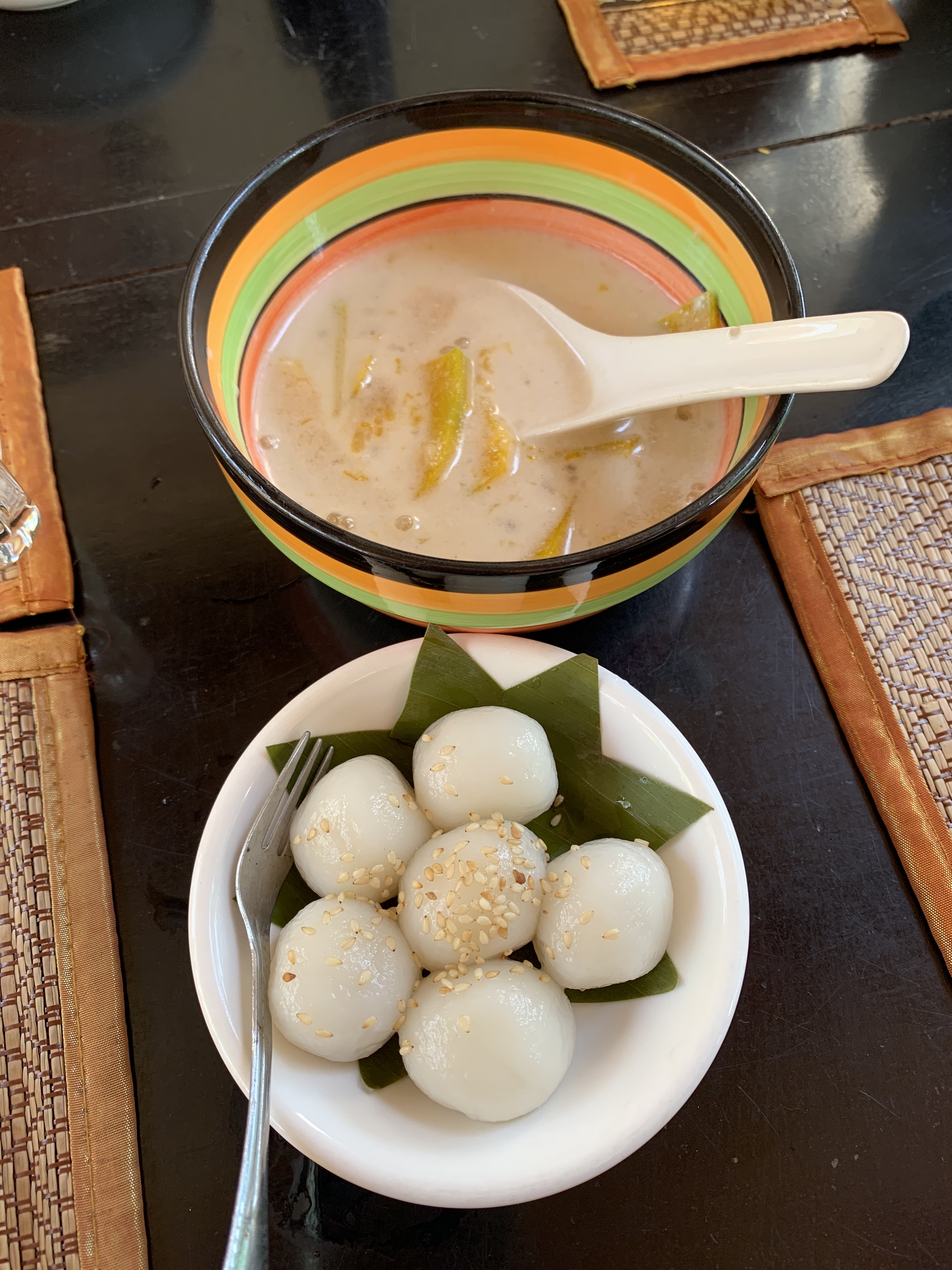 And a dessert selection of either glutinous rice balls with palm sugar, or pumpkin in coconut sweet cream.