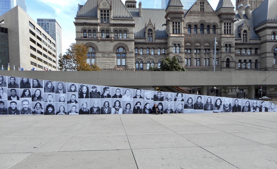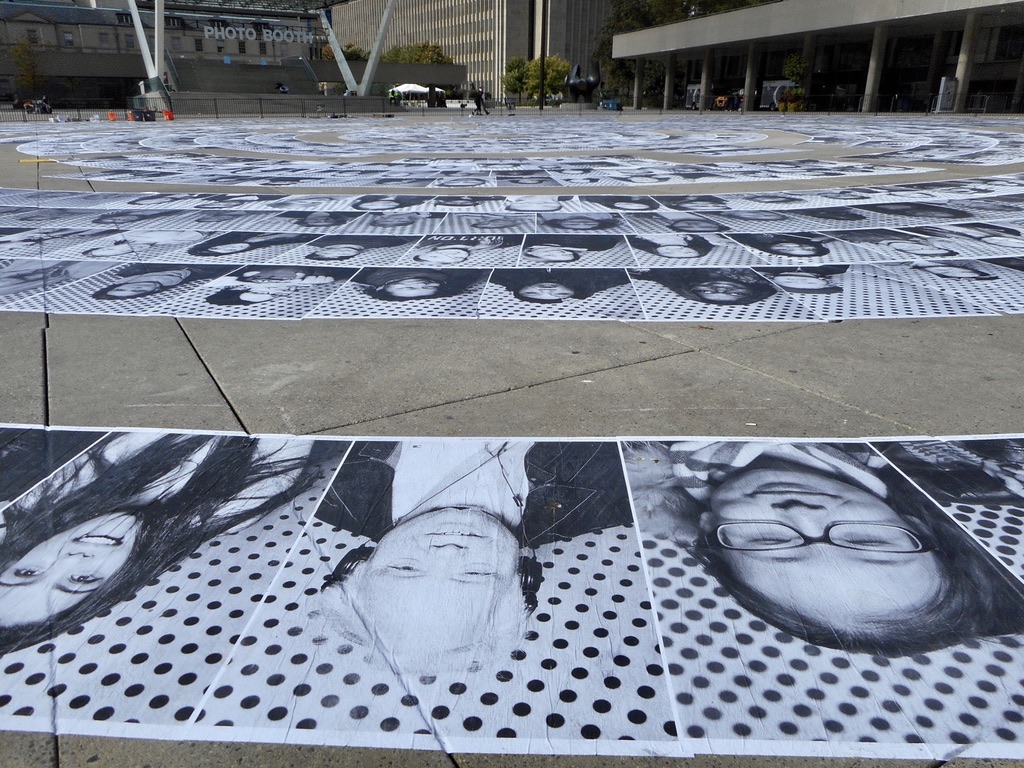 Inside Out by New York based artist JR, a large scale interactive photo installation featuring self-portraits taken by participants at the attached photo booth in Nathan Phillips Square.