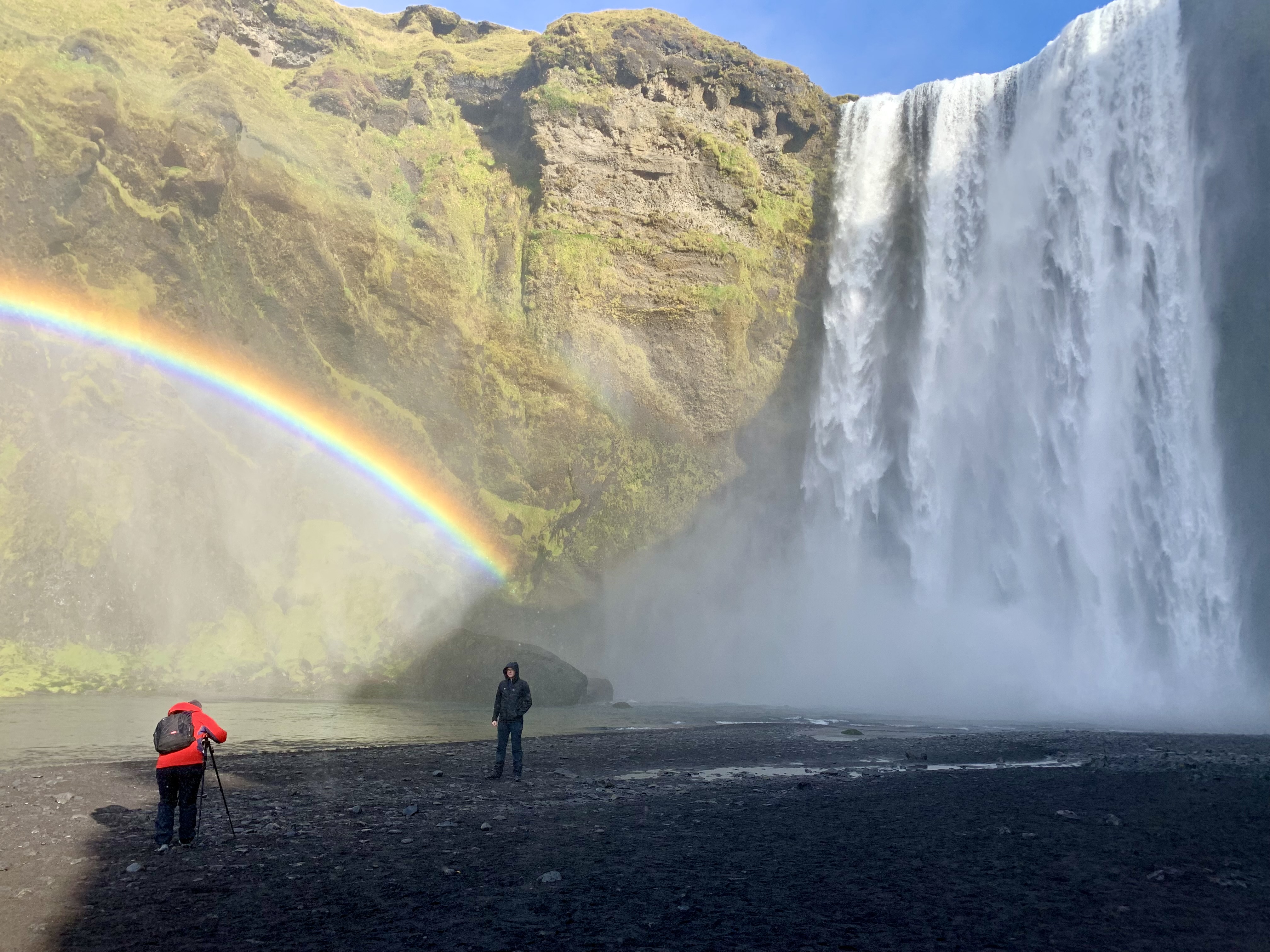 We started off with a visit to another impressive Icelandic waterfall — Skógafoss, situated on the Skógá River at the cliff marking the former coastline. Skógafoss is one of the largest waterfalls in Iceland, measuring 82 feet wide and dropping 200 feet. According to legend, the first Viking settler in the area, Þrasi Þórólfsson, buried treasure in a cave behind the waterfall. On sunny days, you can frequently see a single or double rainbow over the waterfall, which seems apropos of the treasure legend.