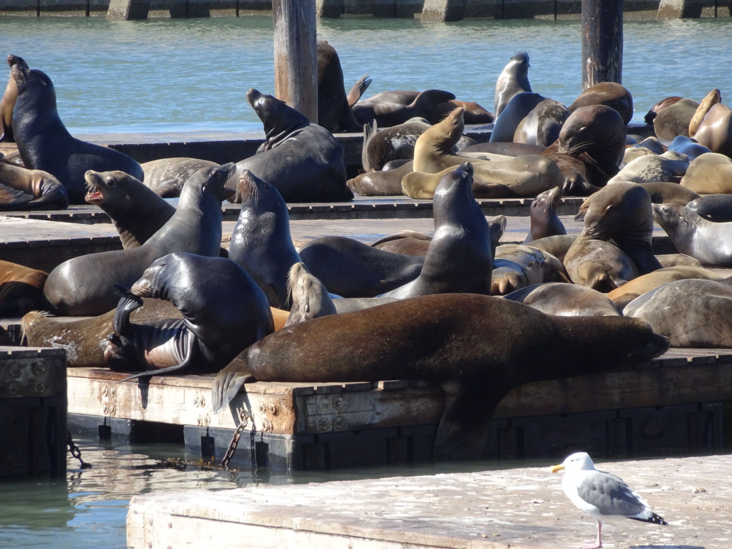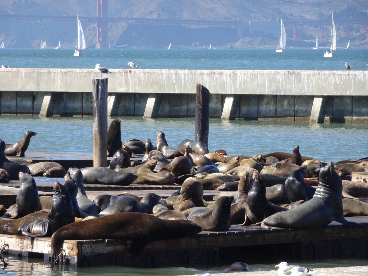 At Pier 39, you can find a large colony of California sea lions that started to haul out there in 1989. As of 2017, an estimated 150 to 600 seals were counted around the pier. Their numbers have ranged as high as 1,700 back in 2009, fluctuating depending on the nearby food supply.