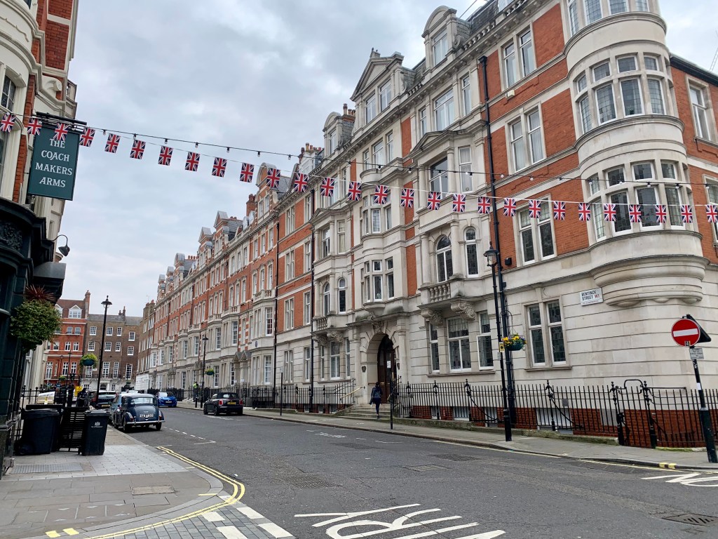 We had arrived the previous evening via the Eurostar train from Paris and had a delicious Indian dinner at Dishoom. The next morning, we went out to explore a bit of the Marylebone district, where we were staying. We were in London during yet another historic event, with the streets decked out in preparation for King Charles’ upcoming coronation.