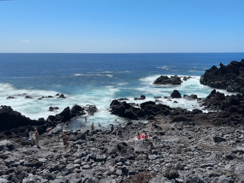 After we were sufficiently fed, we headed off to Mosteiros. This village is best known for its beach, made of dramatic black volcanic sands reminiscent of our time in Iceland.