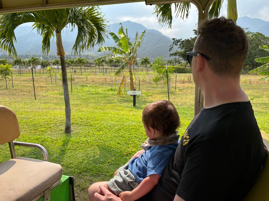 The Maui Tropical Plantation is a working farm in the Upcountry area of Maui. It was a one hour drive from the Hyatt and we arrived in early afternoon in time for lunch at Cafe O’Lei. The plantation itself is free to enter but we bought tickets on site to go on the tram tour, which took us around the grounds to learn about the crops that they grow and to watch a coconut husking demonstration. Teddy wasn’t really interested in the tour but loved running around on the open fields and seeing the ducks.