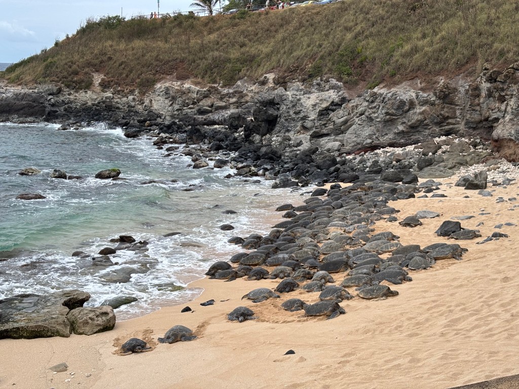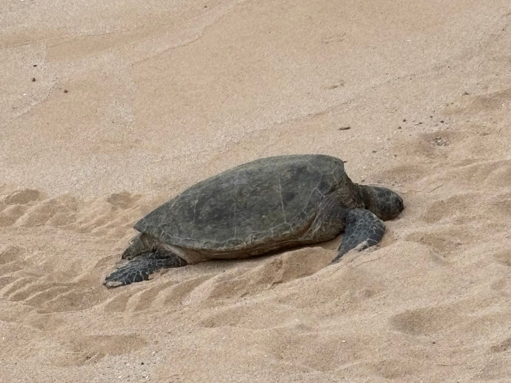 After an hour or so at Iao Valley, we headed to the town of Paia for lunch at Paia Fish Market. On the way back to the hotel, we stopped at Ho’okipa Beach to see the giant sea turtles. There are about 80 Hawaiian green sea turtles that sit on the sand here. They are cordoned off by a rope but you can get close enough for a good view. The water is super choppy so not good for swimming, but probably perfect for surfing.